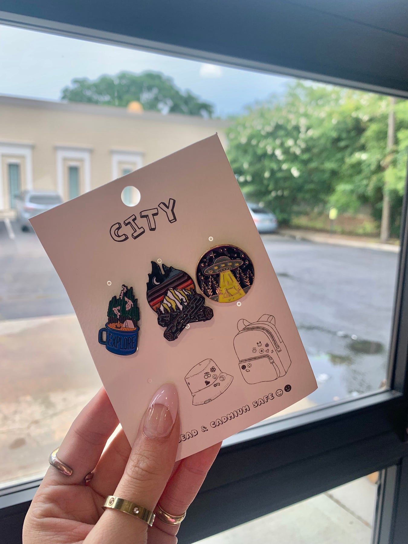 Make a great addition to your traveling gear with the Camping Pins Set! This set features 3 pins that can be added to your backpack or hat, and a rubber back covering.