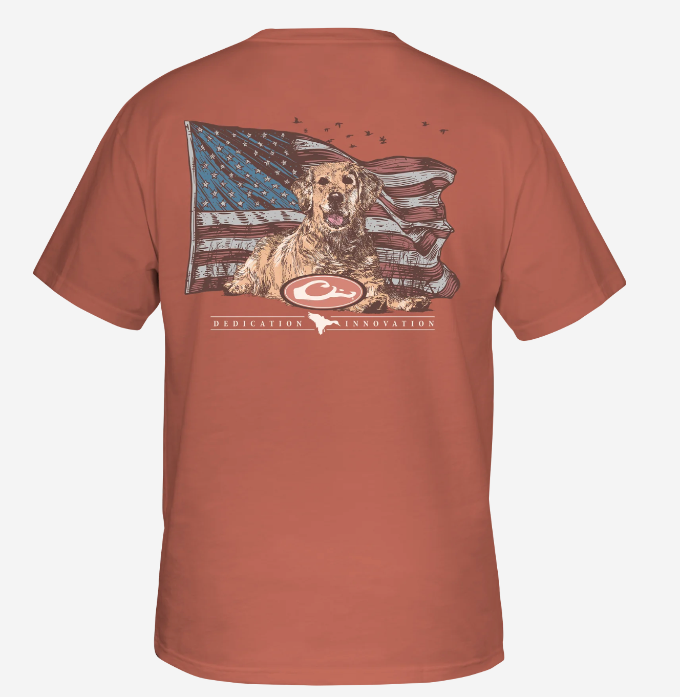 Introducing our Americana Yellow Lab Short Sleeve Tee! Featuring a vibrant yellow lab design from Drake Waterfowl, this tee is perfect for both casual and outdoor wear. Make a statement with this comfortable and stylish shirt.