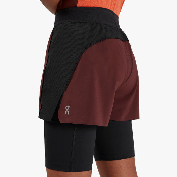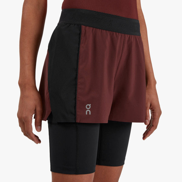 The On Running women's active shorts are great for running or workouts. The 2 in 1 double layer of spandex and flowy shorts can have a double layered look or single spandex option!