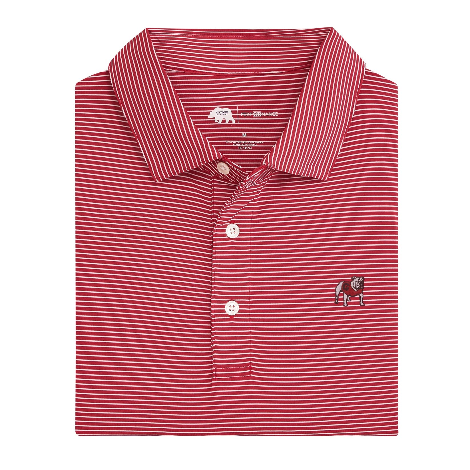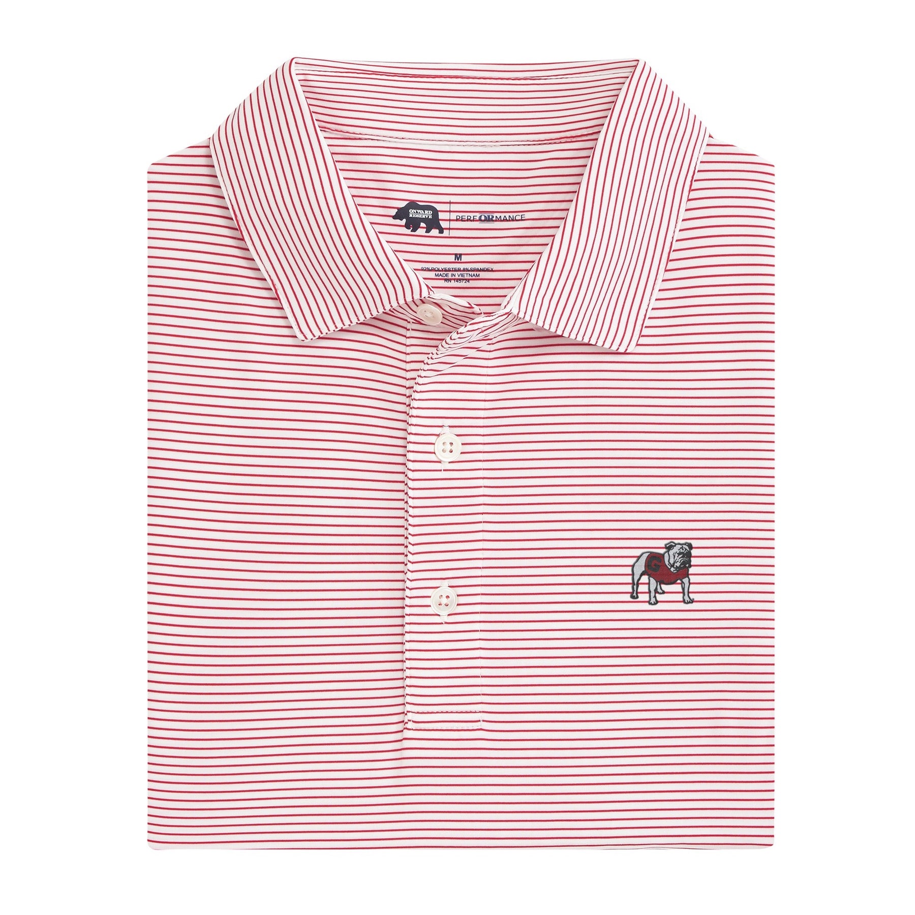 Introducing the Birdie Stripe Standing Bulldog Polo, a must-have for any UGA fan. Made with quick-drying material and UPF protection, this polo will keep you cool and protected on the course. Featuring a standing bulldog logo, show off your team pride in style.