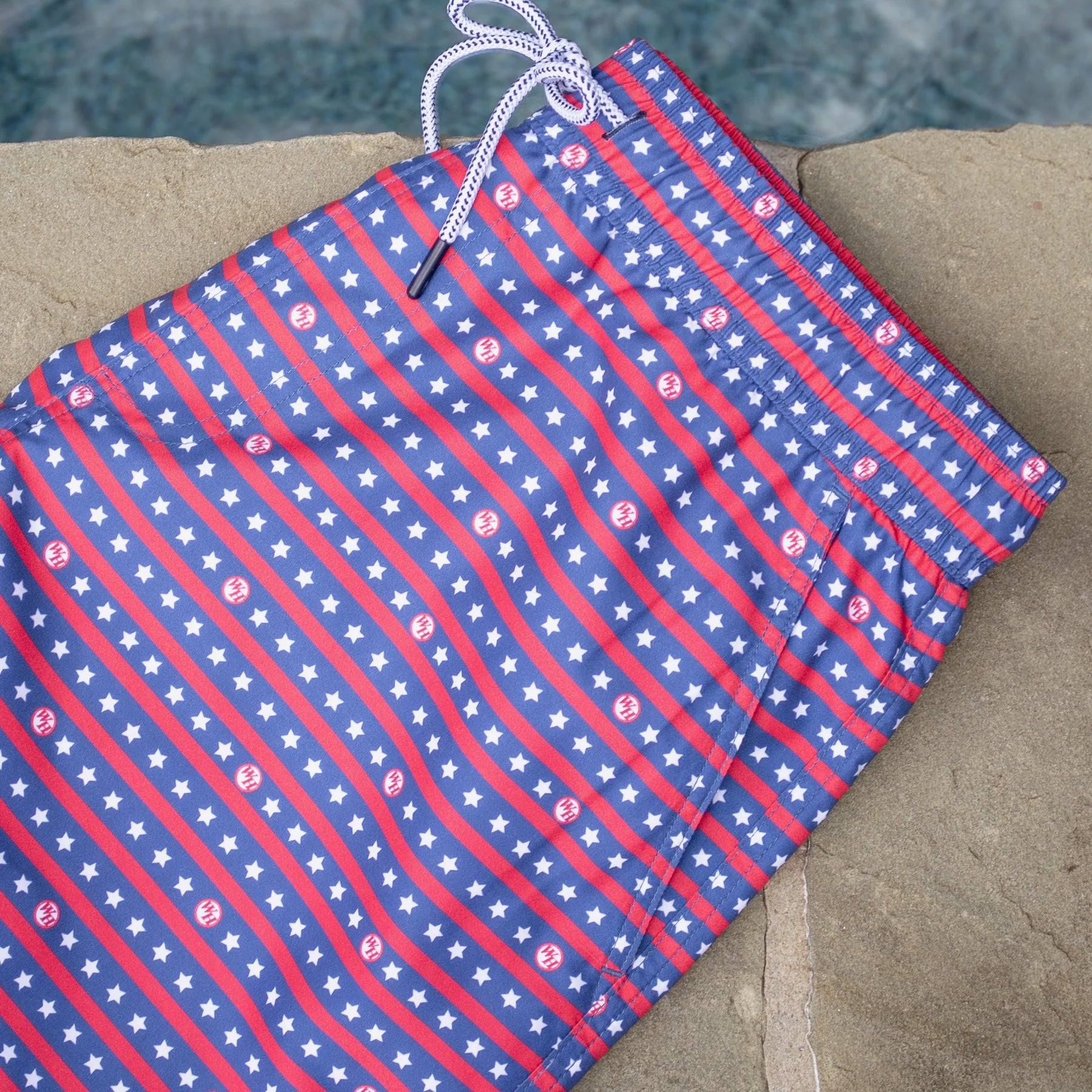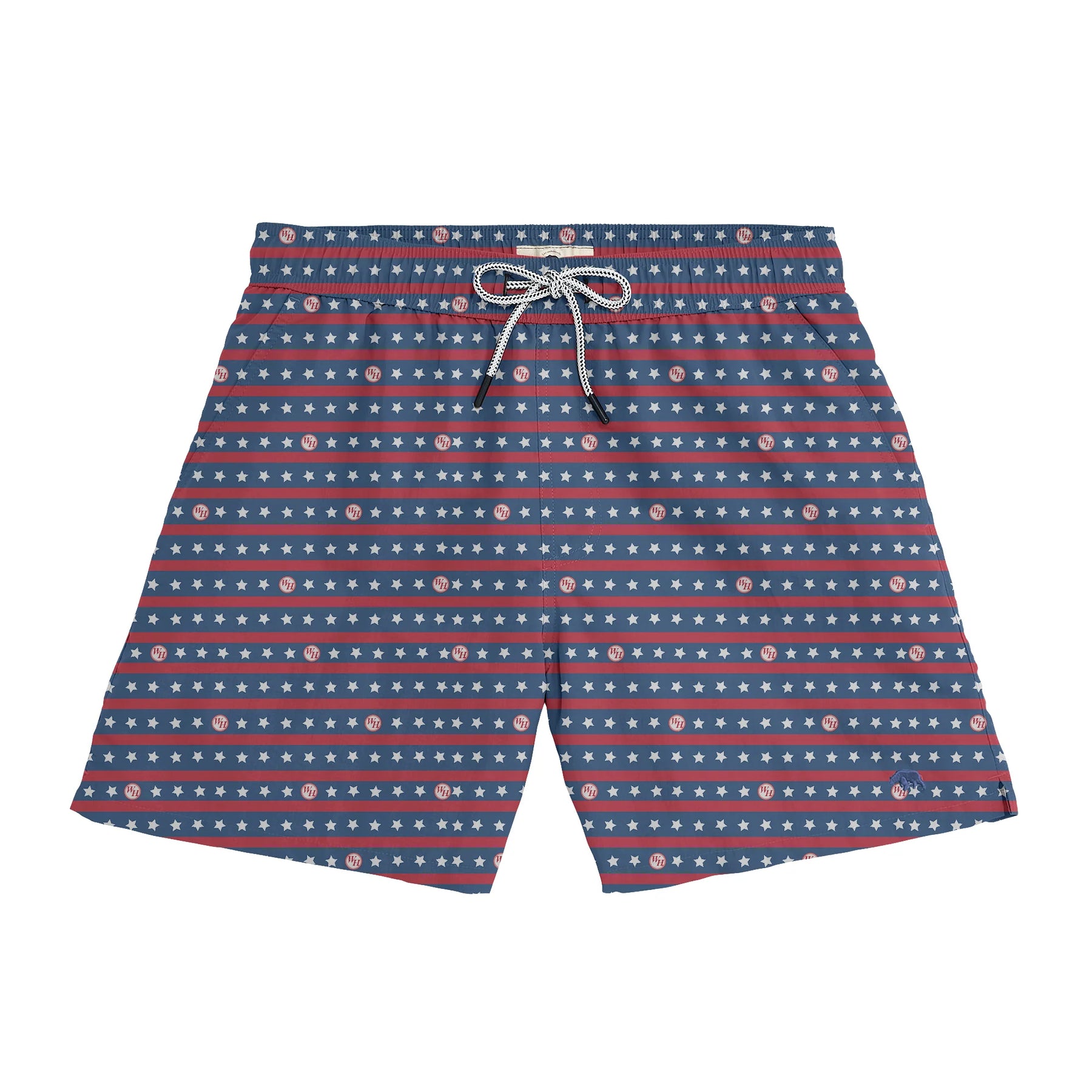 Elevate your poolside style with the Onward Reserve Waffle House Stars and Stripes Swim in True Navy. These premium swim shorts combine patriotic flair with practical performance features. Designed for comfort and quick-drying capability, they transition seamlessly from water activities to casual wear. The distinctive Waffle House branding adds a unique touch to this American-inspired design.