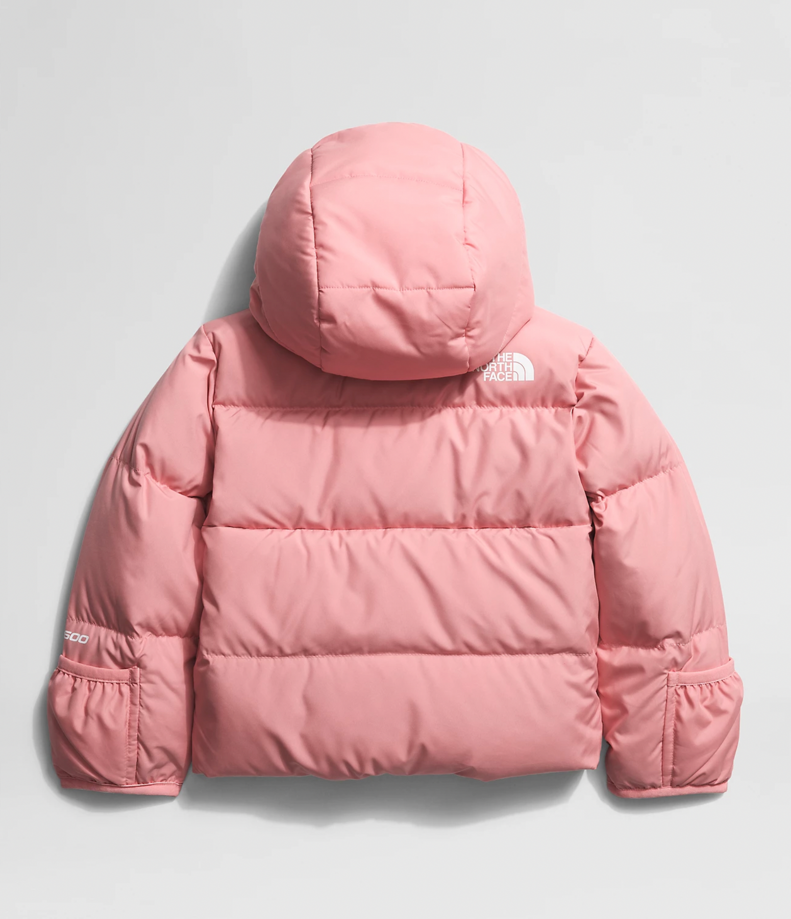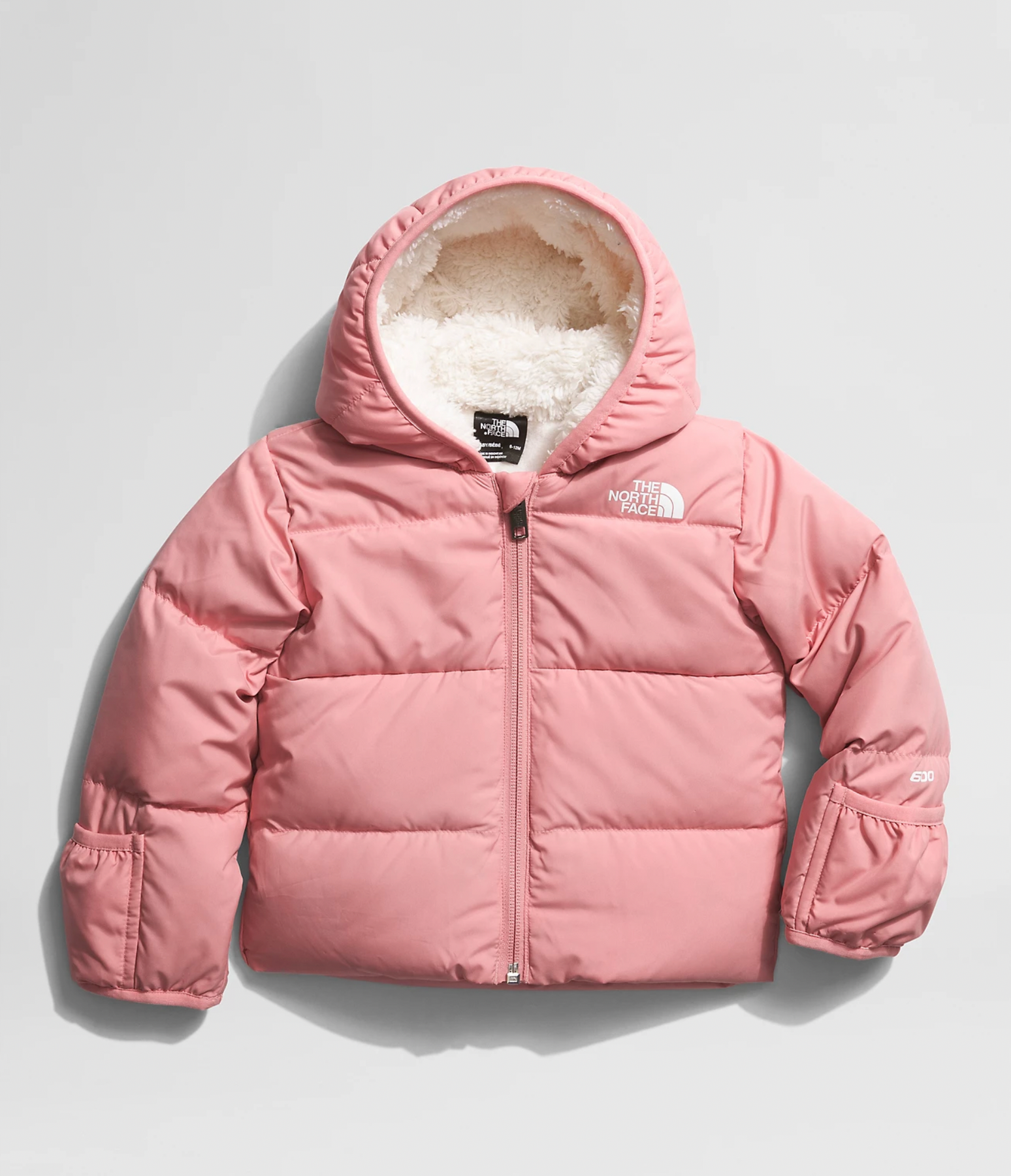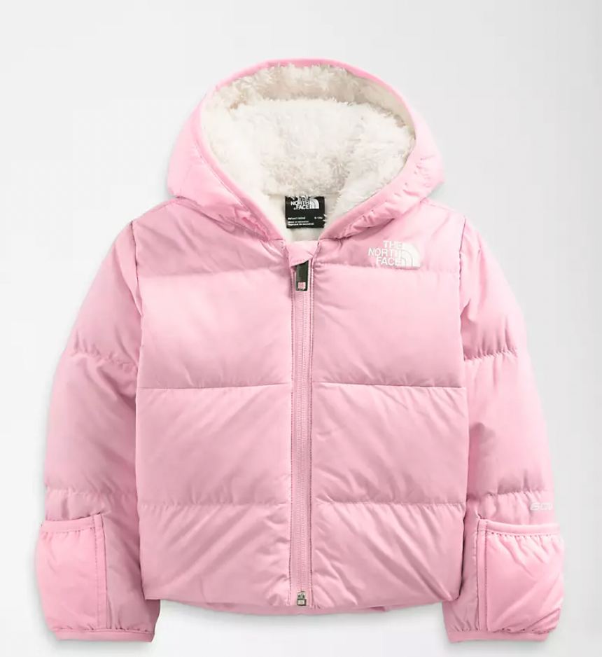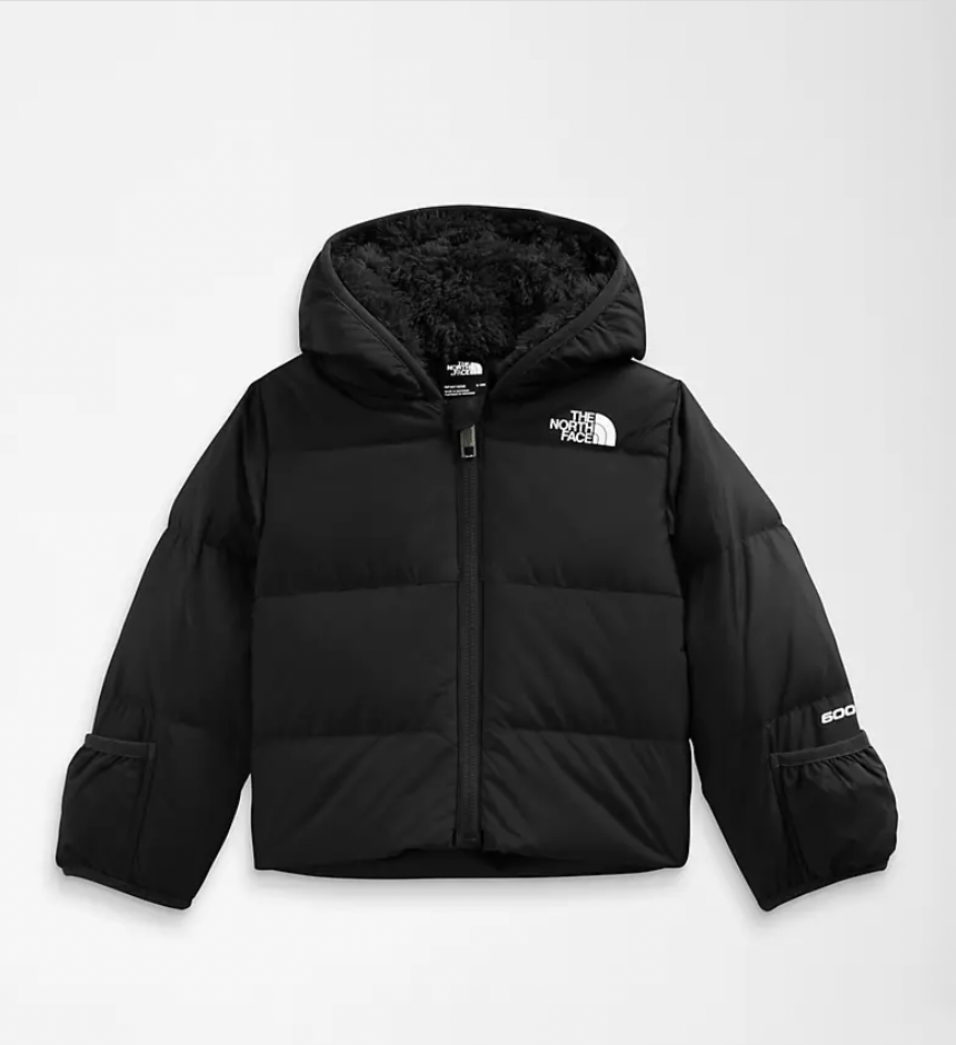 Baby puffer jacket from the north face with fur lining the hood, features a full-zip and fold over cuff to keep their hands warm.