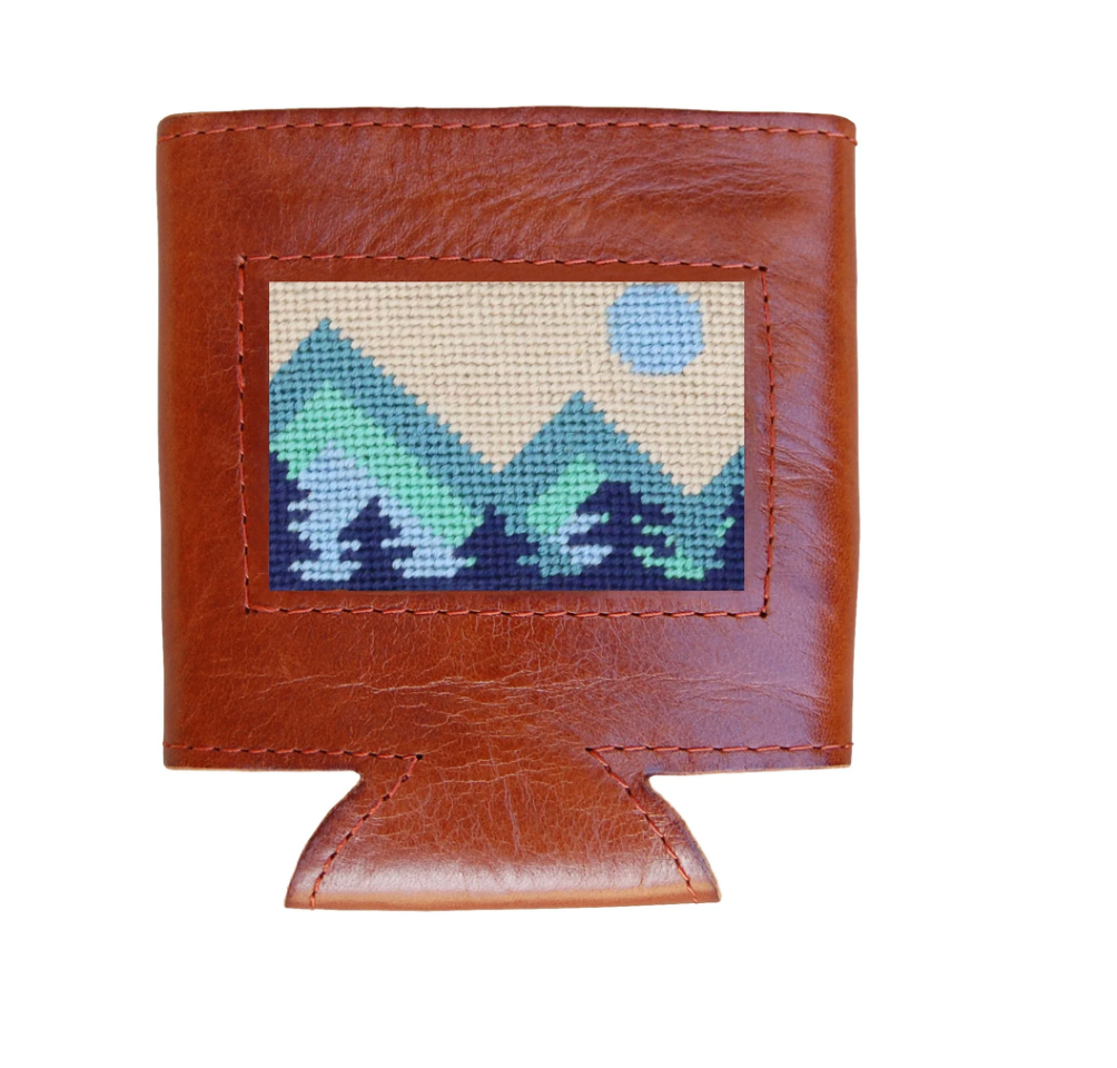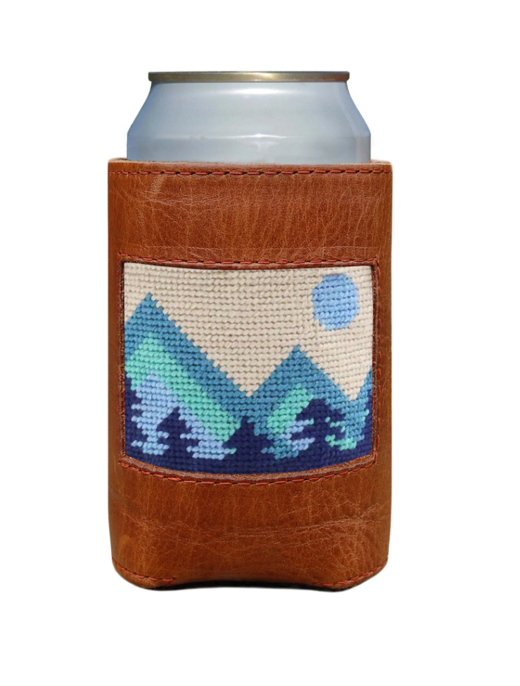 Keep your drinks cool with style! Our Mod Mountain Can Cooler features a 100% hand-stitched needlepoint design, French cotton stitching, and a full grain Italian leather exterior. The neoprene liner ensures your drink stays cool. Can you find a cooler way to dress up your drink?