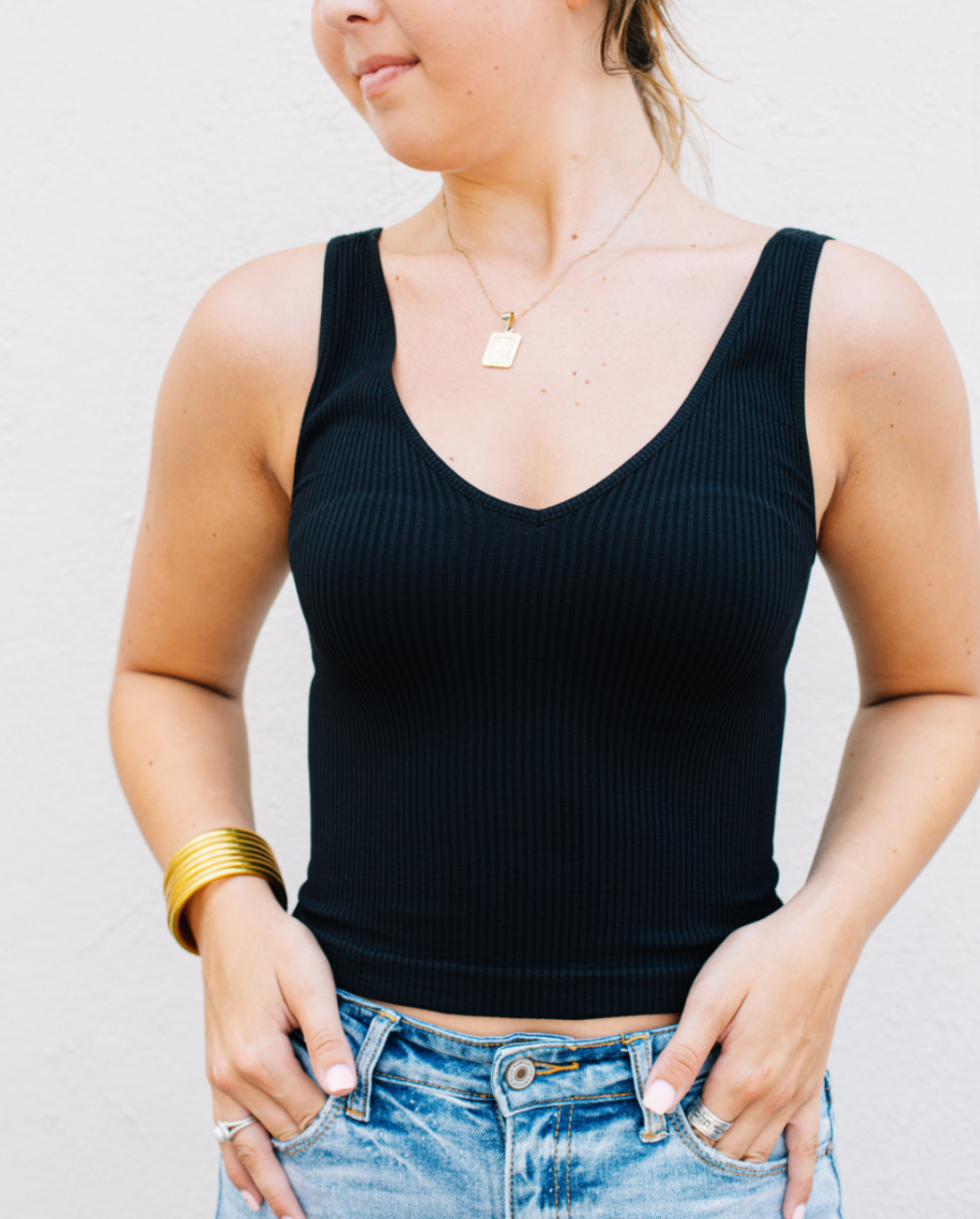 This one size tank is an essential basic that everyone needs in their closet! It is a ribbed, seamless knit that features a v neckline, and a trendy cropped silhouette. This top has a stretchy, universal fit that everyone can wear!